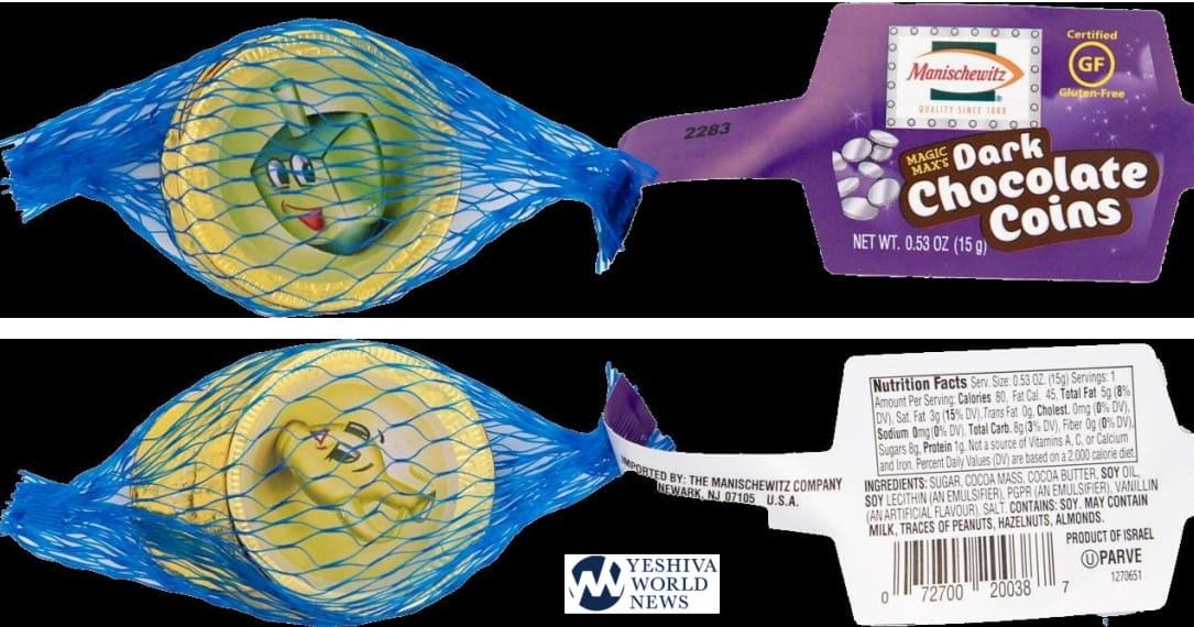 Manischewitz is recalling Manischewitz Dark Chocolate Coins, due to some coins being labeled “dark chocolate” but containing gold foil coins with a blue netting, which are dairy. People who have