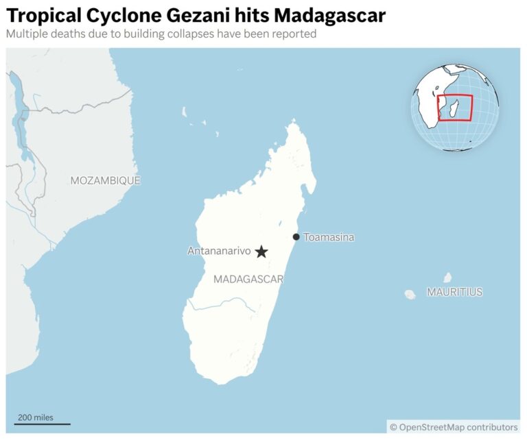 Tropical Cyclone Gezani made landfall in Madagascar’s main port city, unleashing winds that collapsed houses and left at least nine people dead on the Indian Ocean island, authorities said Wednesday.
