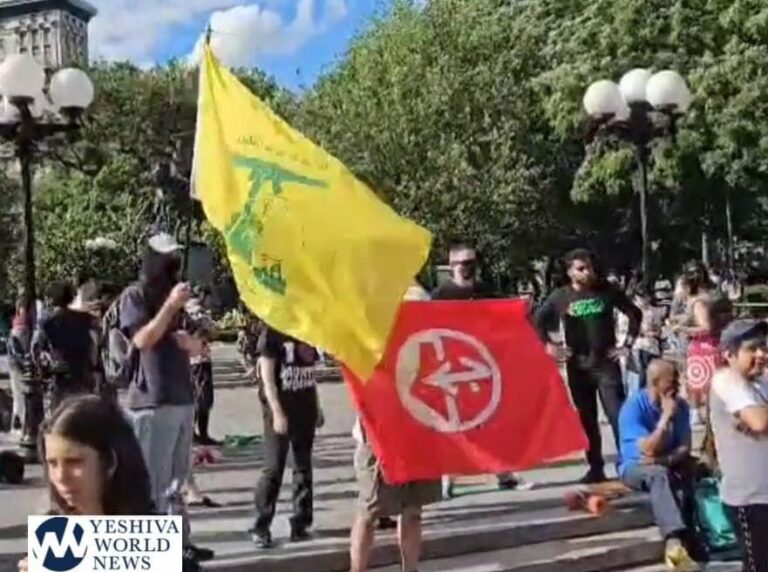 Anti-Israel protesters chanted “Long live the Intifada” and waved a Hezbollah flag outside a memorial exhibit honoring the 364 victims of the October 7 Nova Music Festival attack on Monday