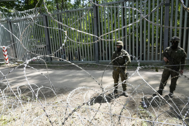A Somali woman pushes her bandaged hand between two vertical bars of a thick metal barrier separating Belarus from Poland as she and four other women gaze toward the European