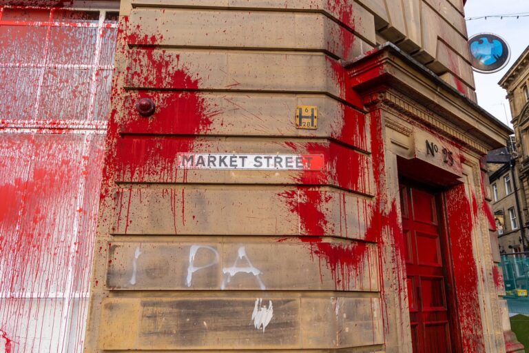 A Barclays branch in Bolton, England, was vandalized in the early hours of Monday morning, with windows smashed and red paint thrown inside and outside the building. Palestine Action, a