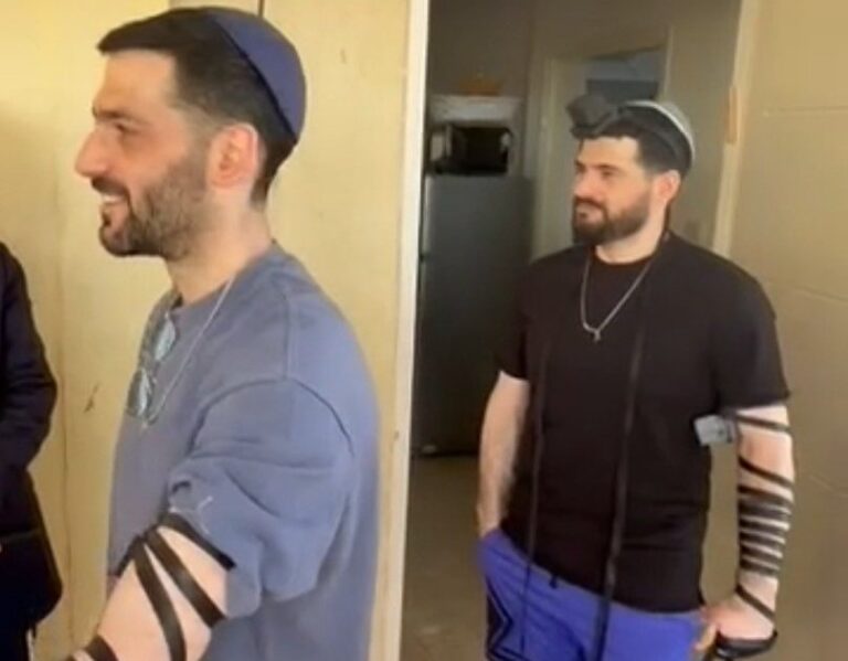 Freed twin hostages Gali and Ziv Berman put on tefillin on Wednesday during a visit by Ba’al Chessed Shai Graucher and U.S. donors, including Rabbi Moshe Scheiner of the Palm