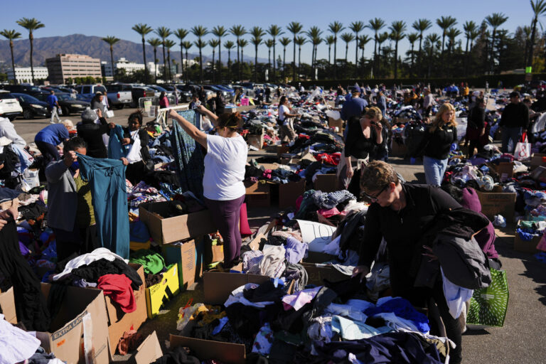 A growing force of firefighters and equipment moved into the Los Angeles area Monday as another round of powerful winds threatened to trigger new wildfires and set back recent progress