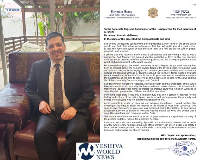 Rabbi Binyamin Hamra, the chief rabbi of the Syrian Jewish community in Israel, has reached out to Syria’s new leader, Ahmed al-Sharaa, congratulating him on his victory over the Assad