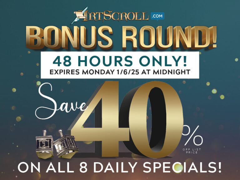 During Chanukah, ArtScroll offered 8 amazing daily specials at 40% off. Missed out? Don’t worry! From Motzei Shabbos through midnight on Monday, we’re bringing back all 8 deals! Now’s the perfect opportunity