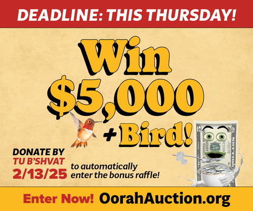 Enter the Oorah Auction before February 13th, and you’ll be automatically entered into a bonus early bird raffle for $5,000 (plus a free bird)! All tickets are still only $5!
