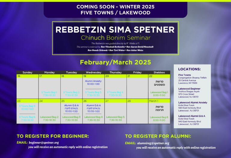 Join Rebitzen Spetner’s thousands of students from around the world who have transformed themselves, their homes, and their relationships with their children. Course Schedule: Lakewood: Fundamental chinuch Course: Dates: Feb