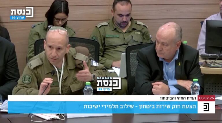 Brig. Gen. Shay Tayeb, the head of the IDF’s Personnel Directorate, provided data on Chareidi recruitment efforts during a meeting of the Knesset’s Foreign Affairs and Defense Committee on Monday,