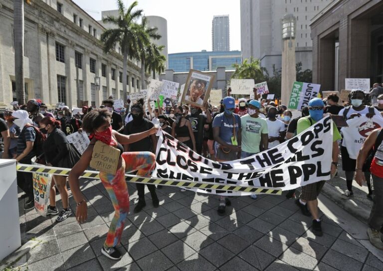 Fort Lauderdale police suspended an officer after video showed he pushed a kneeling black woman to the ground during protests over the police killing of George Floyd in Minnesota, escalating