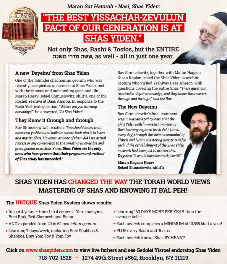 Maran Sar Hatorah – Nasi: “The Best Yissachar-Zevulun Pact of Our Generation Is At Shas Yiden”