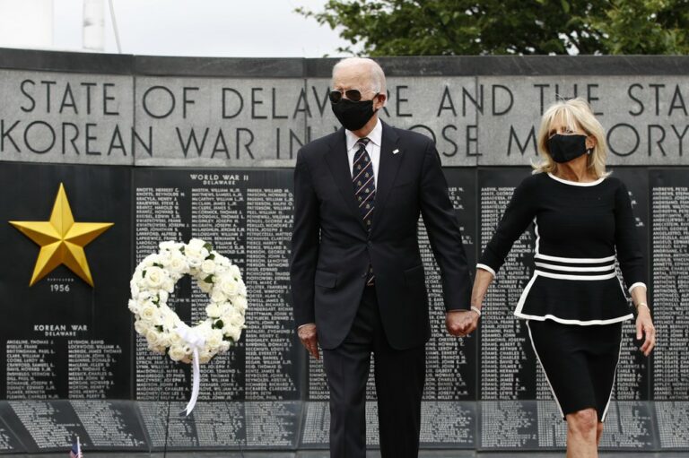 Joe Biden made his first in-person appearance in more than two months on Monday as he marked Memorial Day by laying a wreath at a veterans park near his Delaware