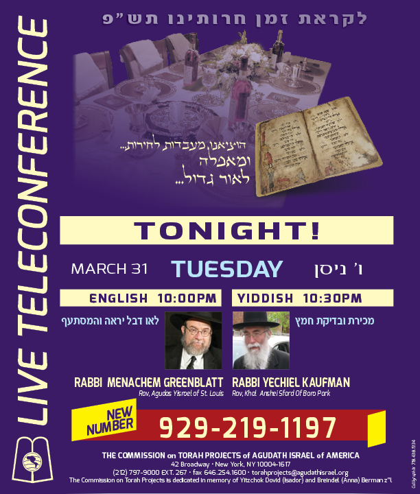 Agudah’s Live Teleconference TONIGHT! Lav Baal Yiraeh, featuring Rabbi Menachem Greenblatt at 10:00 p.m. (English), and Mechiras U’Bedikas Chametz featuring Rabbi Yechiel Kaufman at 10:30 p.m. (Yiddish). Call 929.219.1197