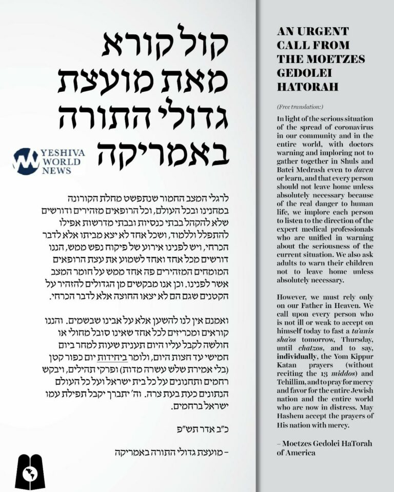 Due to the unprecedented nature of the COVID-19 pandemic, the Moetzes Gedolei HaTorah of America released a statement today, underscoring the seriousness of the situation and the need for everyone
