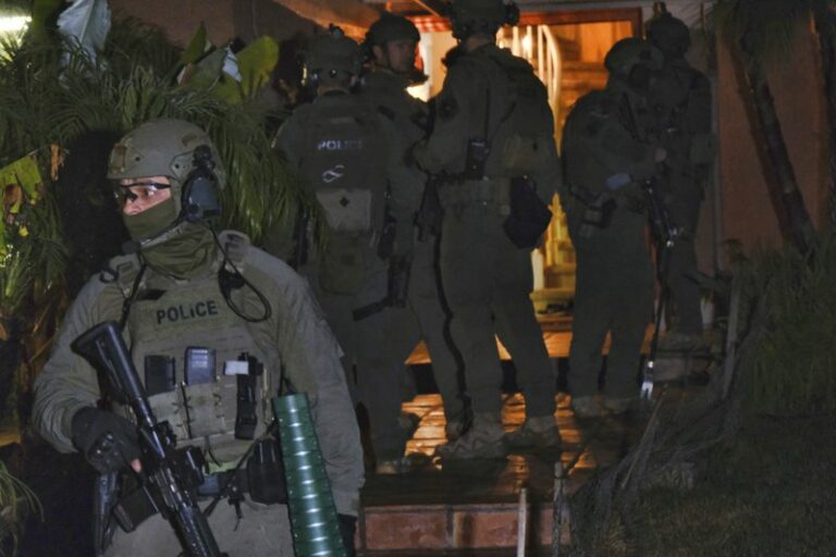 In the darkness, the team suits up quietly, putting on their helmets and tactical gear. Federal agents lug battering rams, bolt cutters and heavy weaponry by foot up a hill