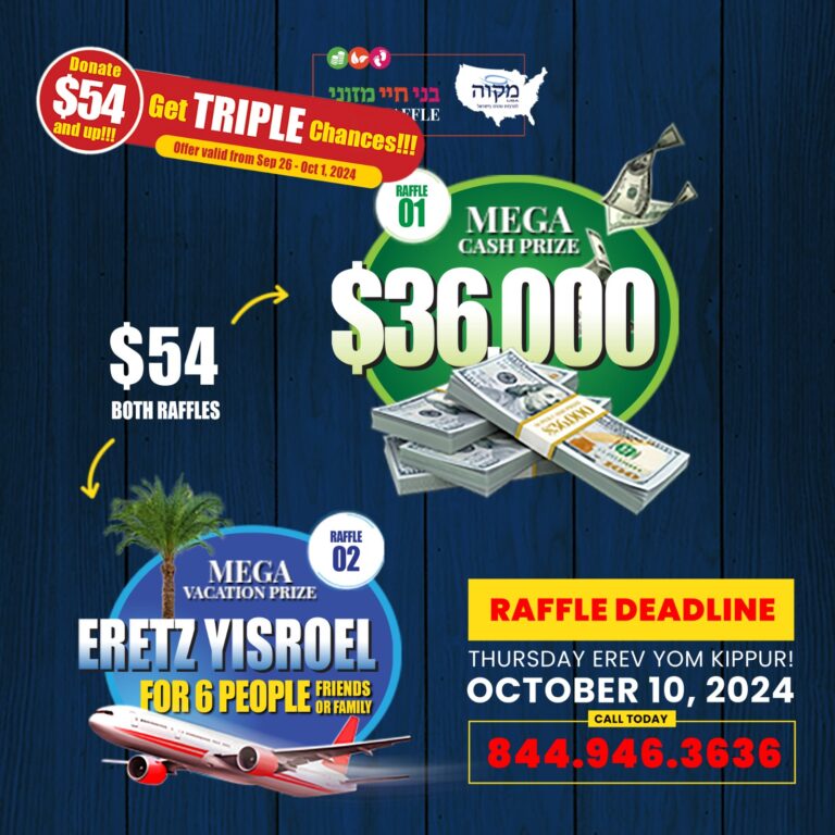 24 HOURS LEFT to TRIPLE!!! Win $36,000! + Trip To ISRAEL for 6!!! Donate $54 & up Get TRIPLE Chances!!! Donate $151 for 18 CHANCES!! 👉 https://mikvahraffle.com/?ref=36
