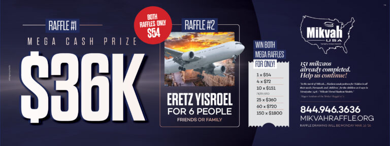 🔥 2 MEGA PRIZES for ONLY $54! 🔥 💰 Raffle #1: $36,000 Cash✈️ Raffle #2: Trip to Israel for 6 💥 10 entries for just $151! Support Mikvah USA —
