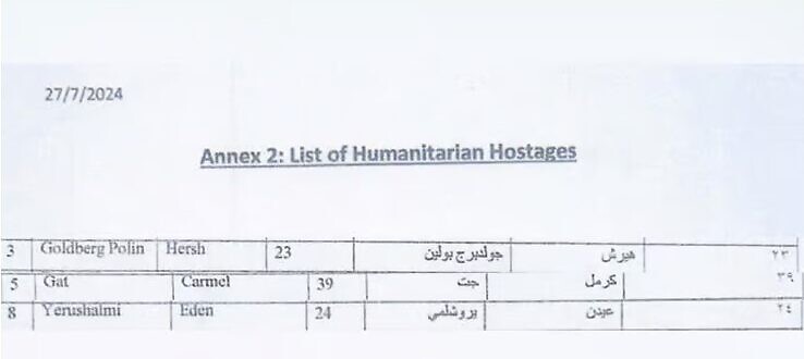 A partial photo of a leaked document published by Hebrew newspaper Yediot Acharonot appears to show that hostages Hersh Goldberg-Polin, Carmel Gat, and Eden Yerushalmi were listed for release in