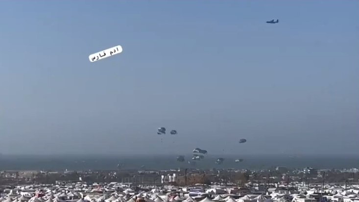 Three American transport planes air-dropped thousands of meals for the “innocent” residents of the Gaza Strip on Shabbos. U.S. military C-130 cargo planes dropped 66 pallets with about 38,000 meals