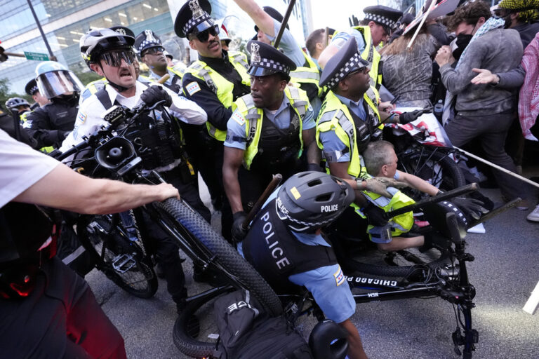 Police handcuffed at least four people and led them away from a pro-Palestinian demonstration after protesters charged a line of officers on the second night of the Democratic National Convention.
