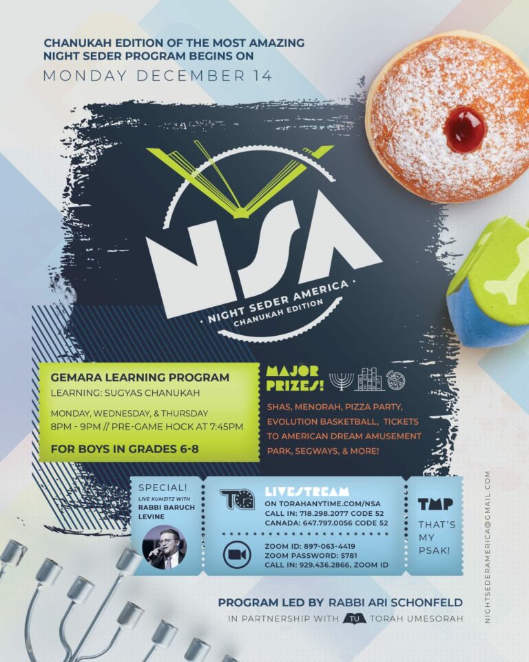 Night Seder America (NSA): Chanukah Edition begins TONIGHT, Monday, December 14th (+ Wednesday and Thursday) NSA’s famous Gemara Learning Program for boys in grades 6-8 combines an interactive game