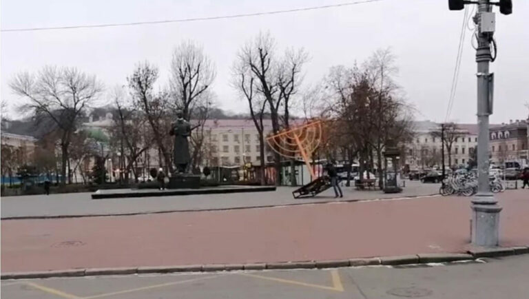 A Ukrainian nationalist videoed himself toppling over a huge communal menorah in Kyiv on Thursday while shouting anti-Semitic statements and posted the video online. “To Ukrainians the power. The Jews