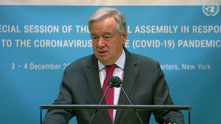 The U.N. chief warned Thursday that the social and economic impact of COVID-19 “is enormous and growing” and said it’s foolish to believe a vaccine can undo damage from the