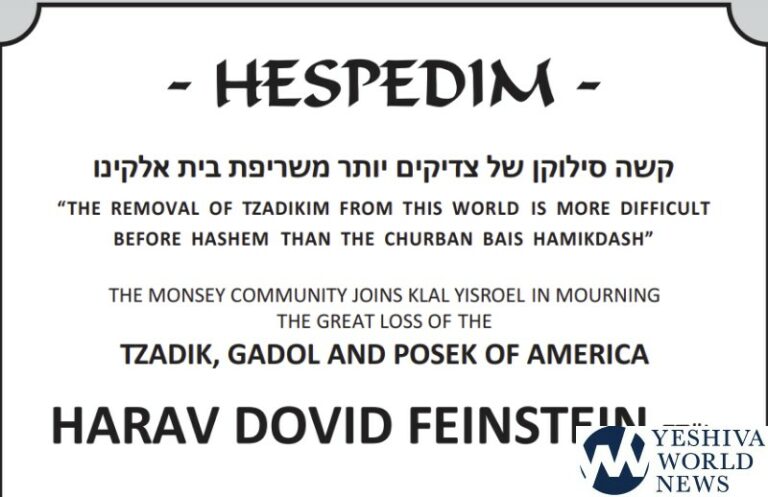 There will be Divrei Hesped in Monsey tonight for Hagaon HaRav David Feinstein ZATZAL. The Hespeidim will be held at 9:30PM at Yeshivas Ohr Someach, 240 Route 306. Hespedim will