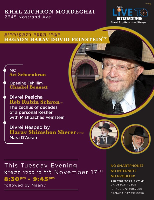 There will be Divrei Hesped in Flatbush tonight for Hagaon HaRav David Feinstein ZATZAL. The Hespeidim will be held at 8:30PM Khal Zichron Mordechai, 2645 Nostrand Avenue (between Avenue L