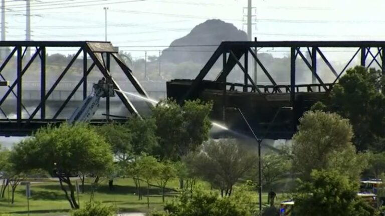A freight train traveling on a bridge that spans a lake in a Phoenix suburb derailed Wednesday, setting the bridge ablaze and partially collapsing the structure, officials said. Video images