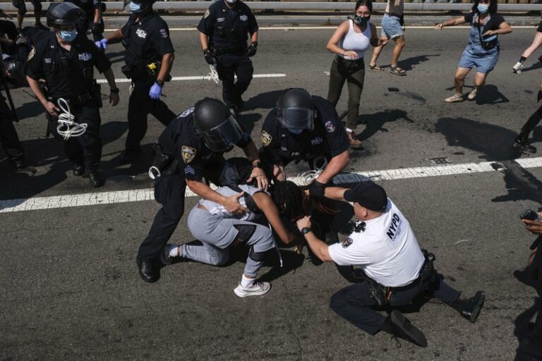 A protest in Oakland, California, in support of racial justice and police reform turned violent when a small group of demonstrators wearing helmets and goggles and carrying large signs that