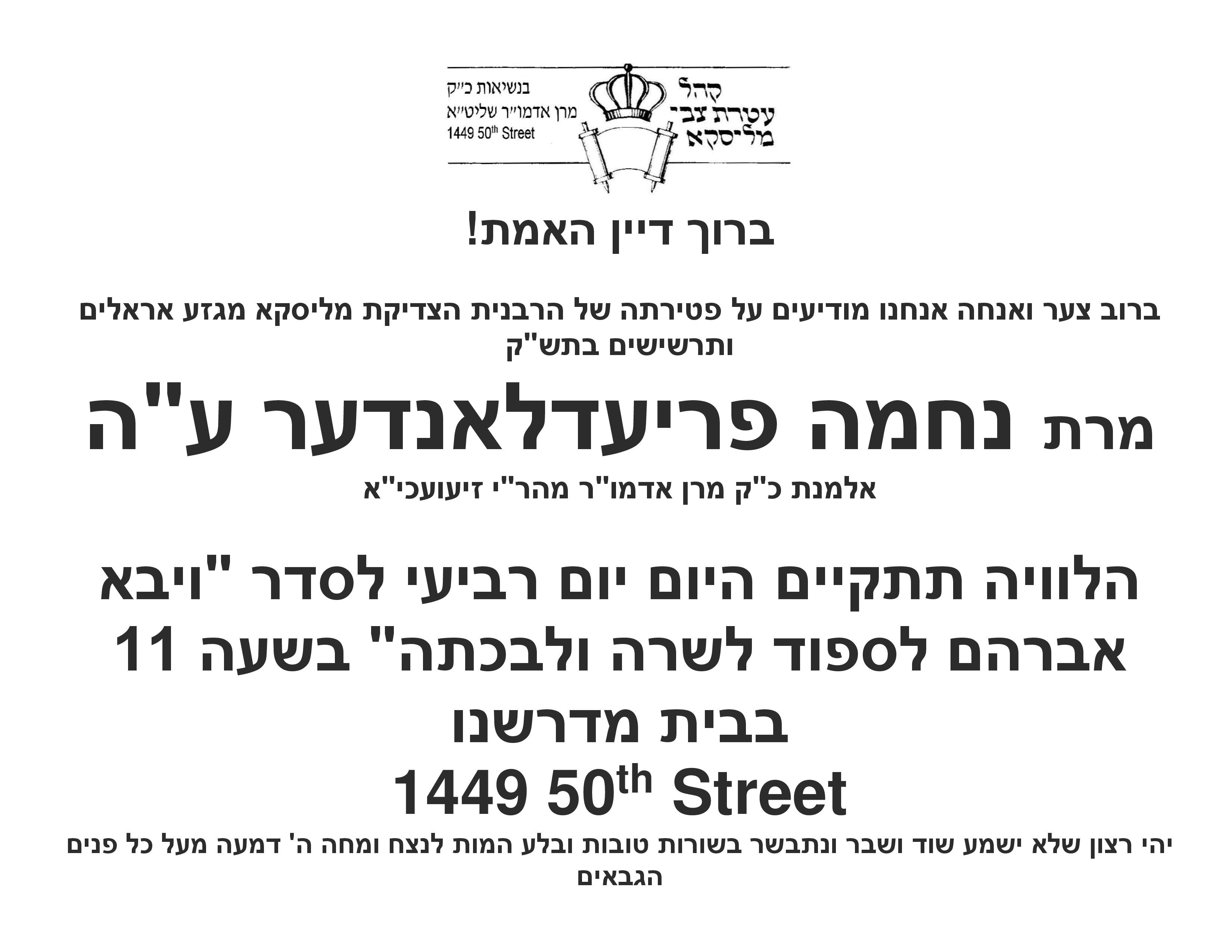 It is with great sadness that we inform the community that the Liska Rebbetzin Nechuma Friedlander A’H was niftar. She is the mother of the current Liska Rebbe.