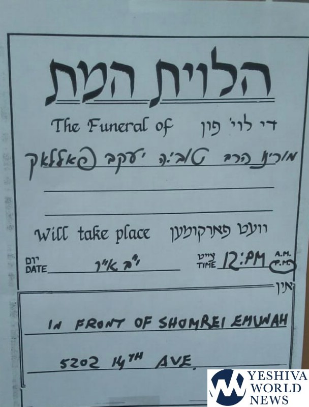 The Levaya will be held at 12:00 noon at the Shul located at 5202 14th Ave.