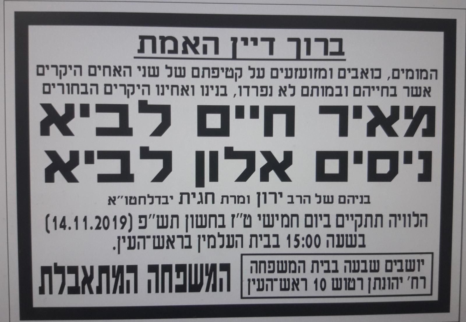 The two men were identified as Meir Chaim Lavi (27) and Nissim Shalom Lavi (19), brothers who lived in Rosh Ha’ayin. Their Father, Rabbi Yaron Lavi moved the family to Rosh Ha’Ayin from Elad last year and opened a shul where he works in Kiruv.