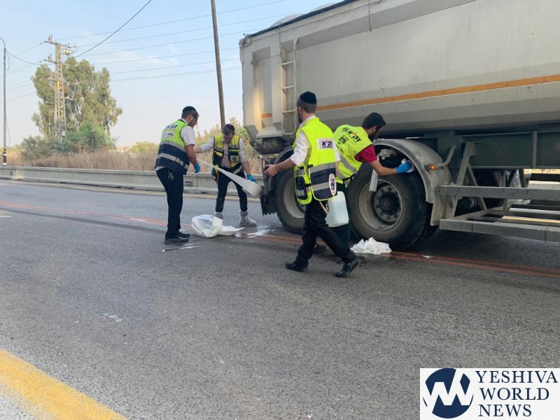 The accident involved a truck and a motorcycle. Emergency medical service personnel who arrived at the scene found two people without signs of life. Zaka volunteers arrived to deal with Kavod Hames, and police closed off the road in both directions and opened an investigation into the incident.