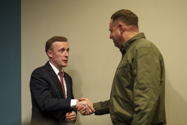 President Joe Biden’s top foreign policy adviser Jake Sullivan sought to reassure Ukrainians during an unannounced visit to Kyiv Wednesday that the U.S. will continue to support their efforts to