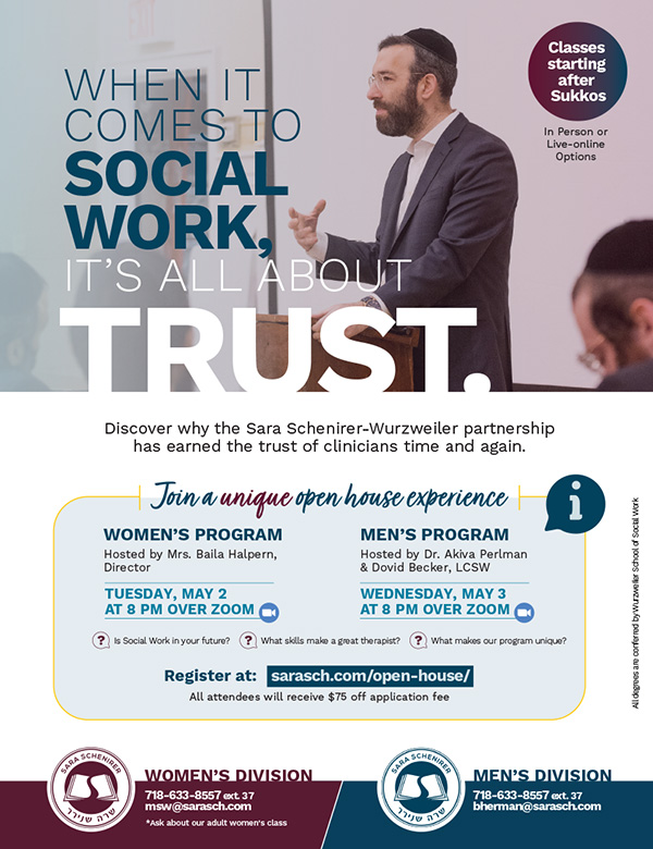 What are the skills that make a great social worker? Hear it from the experts at the Sara Schenirer-Wurzweiler Social Work Information Nights. Women’s ProgramHosted by Mrs. Baila Halpern, DirectorTuesday,