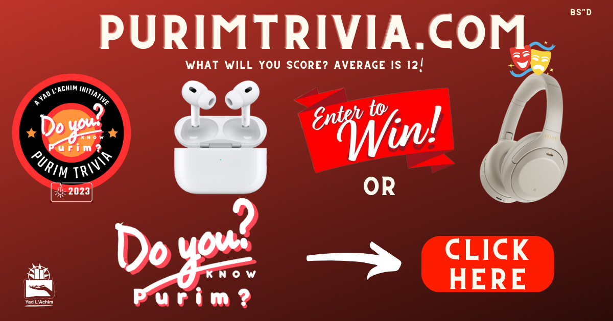 DID YOU TRY OUR AMAZING PURIM TRIVIA QUIZ?? IT’S HARD, BUT FUN – PLAY AND WIN MANY PRIZES INCLUDING YOUR CHOICE OF HEADPHONES!VISIT PURIMTRIVIA.COM OR CLICK HERE TO PLAY