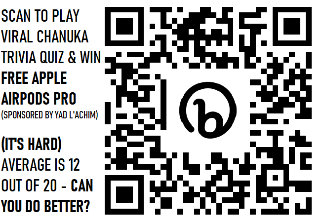 Did you try the not-so-easy Chanuka Trivia Quiz? Most people can’t get 12 out of 20 correct. CLICK HERE TO TRY YOUR SKILLS or visit www.ChanukahTrivia.com (win free entry into