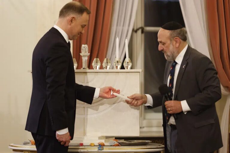 Poland’s president led a Hanukkah ceremony on Monday where he paid tribute to Jewish communities in Poland and worldwide for the help they have extended to Ukrainian refugees this year.