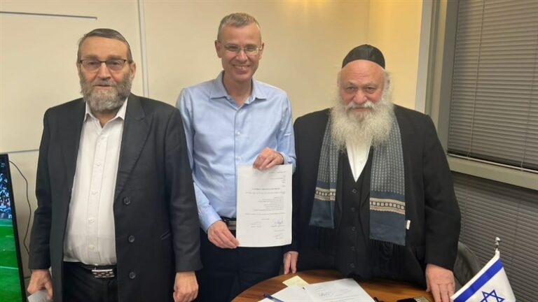 UTJ leaders Yitchak Goldknopf, chairman of Agudas Yisrael, and Moshe Gafni, chairman of Degel HaTorah, signed an interim agreement with the head of the Likud negotiations team Yariv Levin late