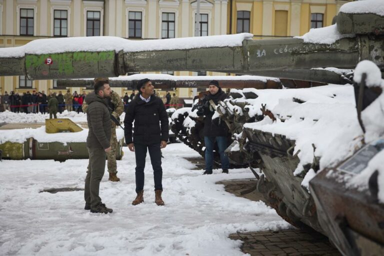 British Prime Minister Rishi Sunak promised 125 anti-aircraft guns and other air-defense technology as he made an unannounced visit Saturday — his first — to Ukraine’s snow-blanketed capital for talks
