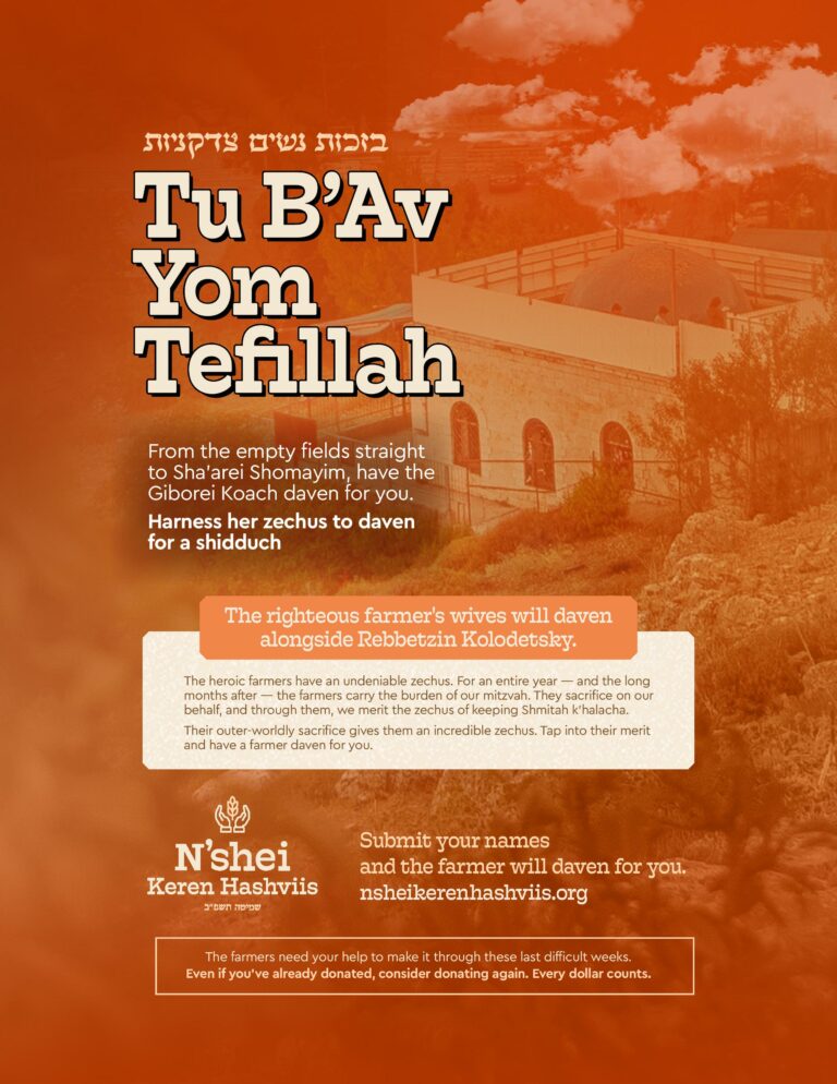 The righteous farmer’s wives have an undeniable zechus. They’ve sacrificed for a difficult mitzvah — even when it threatens their family’s future. The incredible women are Giborot Koach. Now they’re
