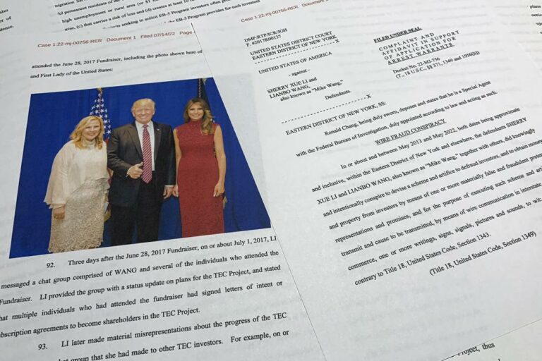 Two Chinese American businesspeople were charged Monday with funneling foreigners’ money into political donations that bought entry to an exclusive dinner with then-President Donald Trump so the duo could impress