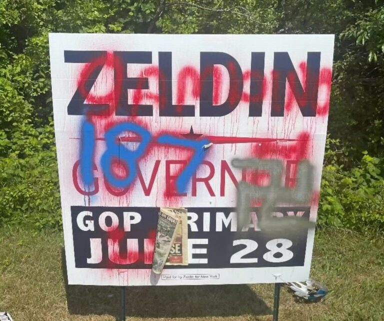 Antisemitic graffiti was found scrawled on a lawn sign in Long Island supporting Rep. Lee Zeldin, the leading Republican candidate for New York governor, just days before the GOP’s primary