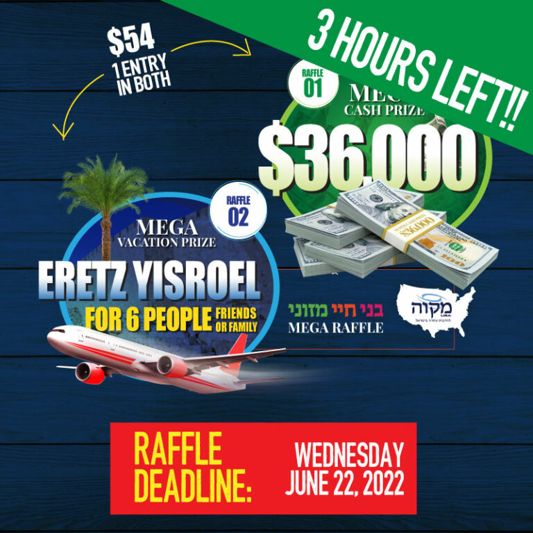 ‼️3 HOURS LEFT‼️ CLICK HERE NOW!! Trip To ISRAEL for 6!! And $36,000!!! CLICK HERE NOW!! Mikvah USA Mega Raffle Last Chance! CLICK HERE NOW!! ‼️3 HOURS LEFT‼️ CLICK HERE