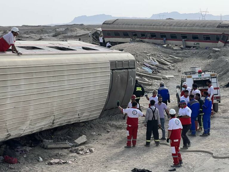 A passenger train traveling through eastern Iran struck an excavator and derailed nearly half its cars before dawn Wednesday, killing at least 21 people and injuring another 47, officials said.