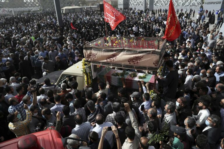 Thousands of mourners poured into the streets of Tehran on Tuesday to pay their respects to a senior Revolutionary Guard member fatally shot by two gunmen on a motorcycle earlier