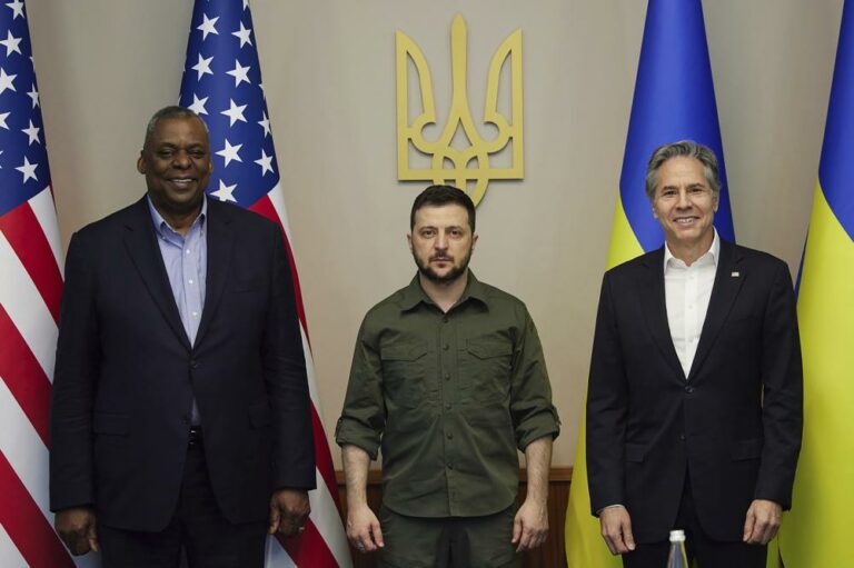 Top American officials pledged Monday to help ensure Ukraine wins its fight against Russia following face-to-face talks with President Volodymyr Zelenskyy in Kyiv, while Britain said Moscow has yet to