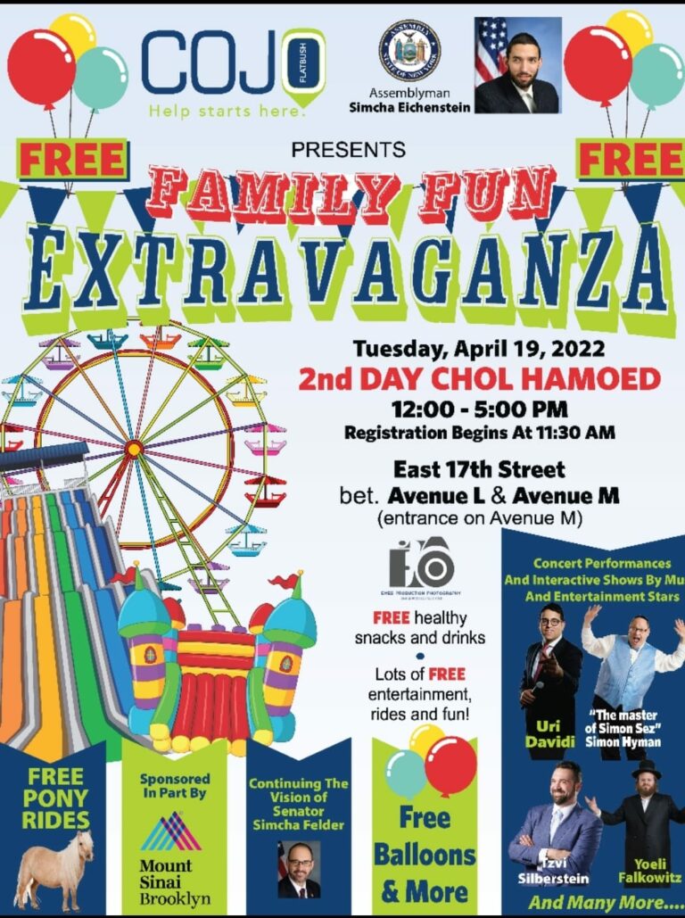 COJO Family Fun Extravaganza in Flatbush! -Free Entrance -Free Pony Rides -Free Balloons -Concert Preformances by Uri Davidi, Tzvi Silberstein, Yoeli Falkowitz, and more! This TUESDAY, APRIL 19TH, 2022, 2nd