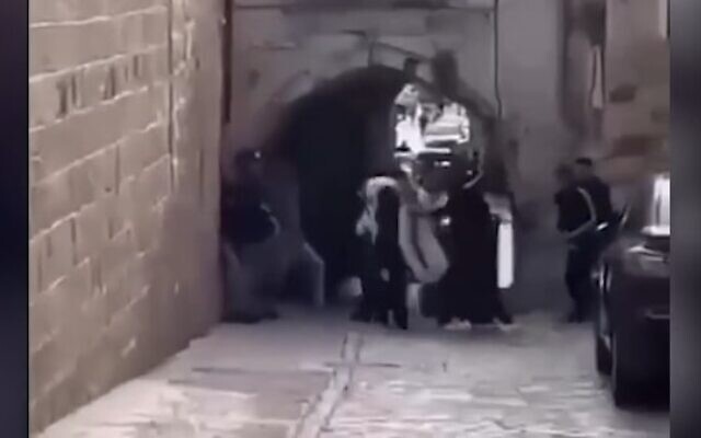 A group of Chareidm wearing Talleisim making their way to the Kosel were attacked and beaten by a group of Palestinians on Sunday, the first day of Chol Hamoed. Video
